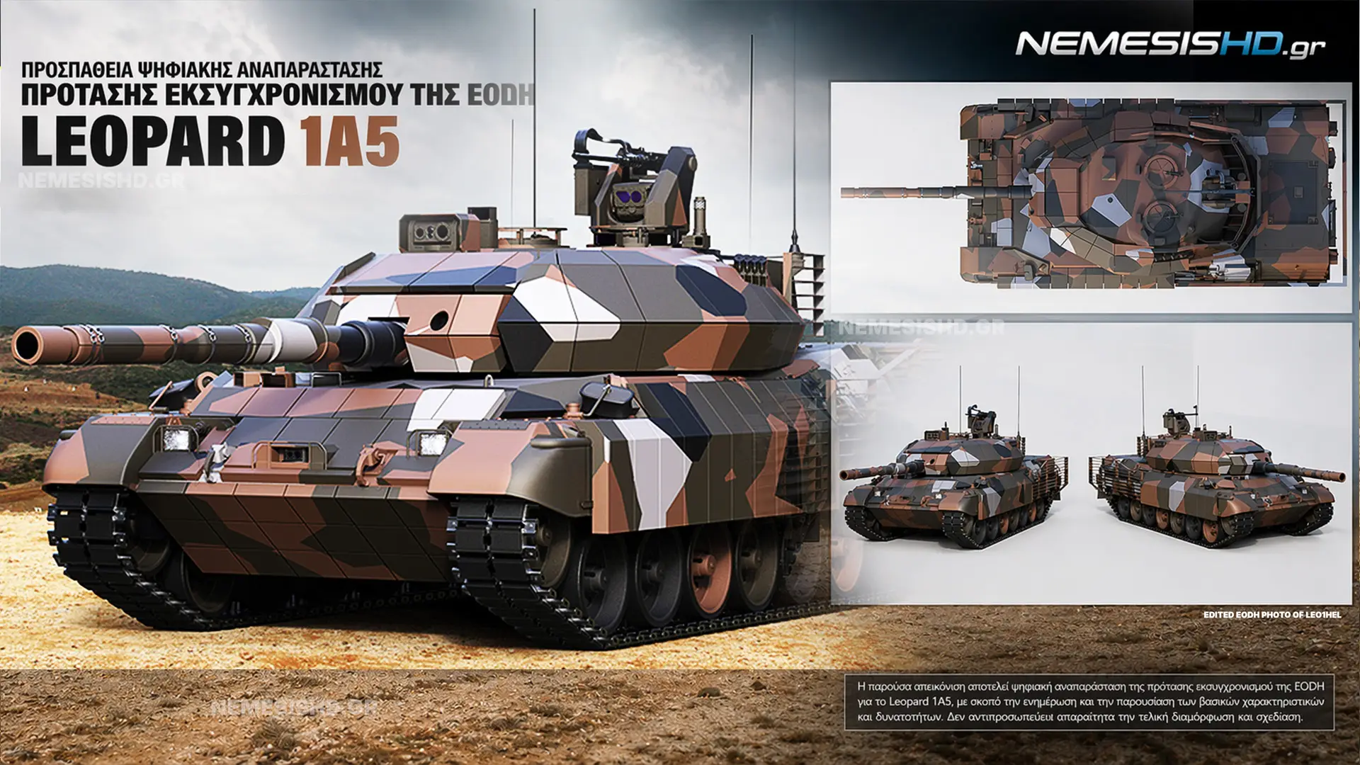 Στο επίκεντρο της συζήτησης για την αξιοποίηση των Leopard 1A5 βρίσκεται η πρόταση της ελληνικής εταιρείας EODH, η οποία έχει αναπτύξει ένα ολοκληρωμένο πακέτο αναβάθμισης υπό την ονομασία Leopard 1HEL. Η EODH, σε συνεργασία με την KNDS (Krauss-Maffei Wegmann) και τη βελγο-ισπανική DUMA, προτείνει τη μετατροπή του Leopard 1A5 σε μια πλατφόρμα που μπορεί να σταθεί επάξια στο σύγχρονο πεδίο μάχης, αντιμετωπίζοντας τις αδυναμίες της βασικής έκδοσης.