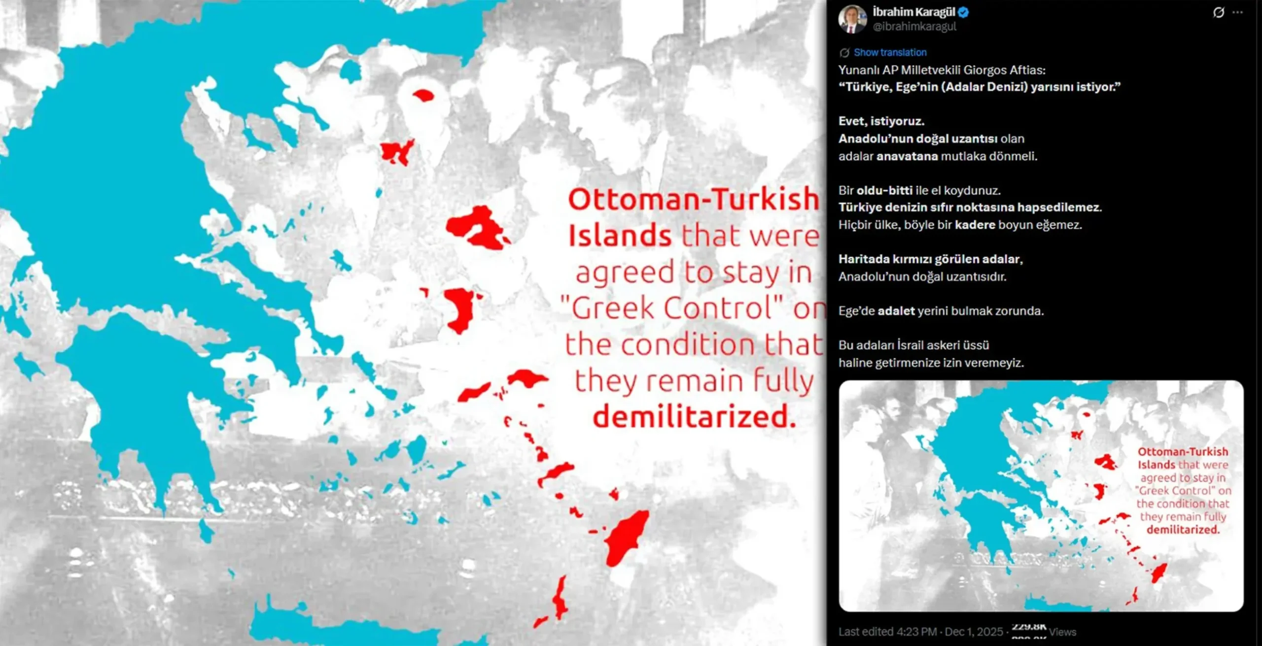 Η δήλωση αυτή αποτέλεσε αφορμή για μια οξεία αντίδραση από τον Ιμπραχίμ Καραγκιούλ, ο οποίος σε δημόσια ανάρτησή του υιοθέτησε ανοιχτά διεκδικητική στάση κατά της Ελλάδας.